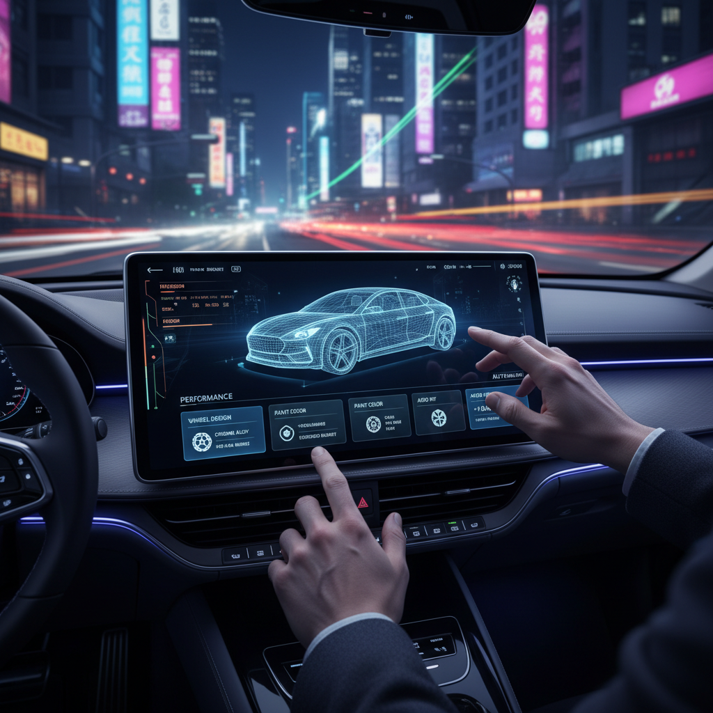 Futuristic AI-powered interface comparing vehicle options in real time, highlighting the new era of car buying service transparency.