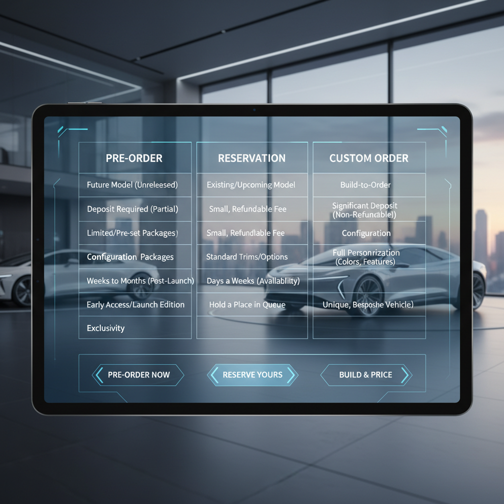 Reserving a car that hasn’t been built or delivered yet, often with a deposit and flexible configurations.