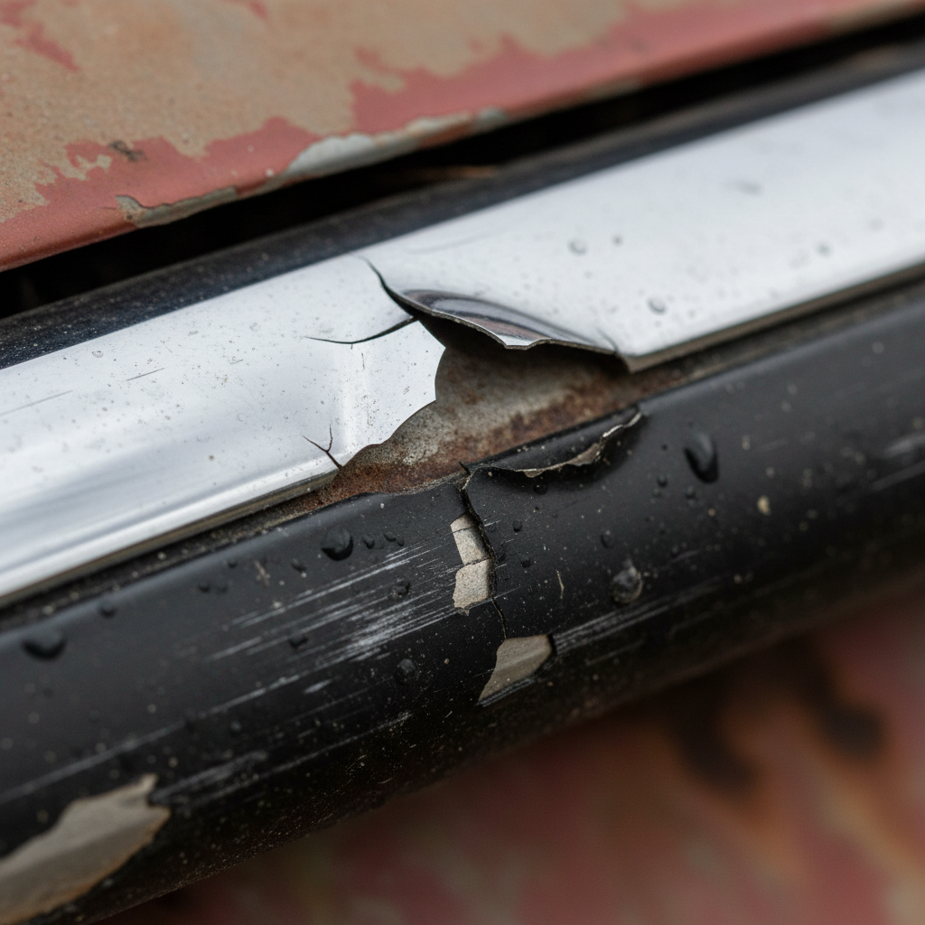 Macro shot of damaged chrome trim with visible peeling and pitting, highlighting maintenance challenges.