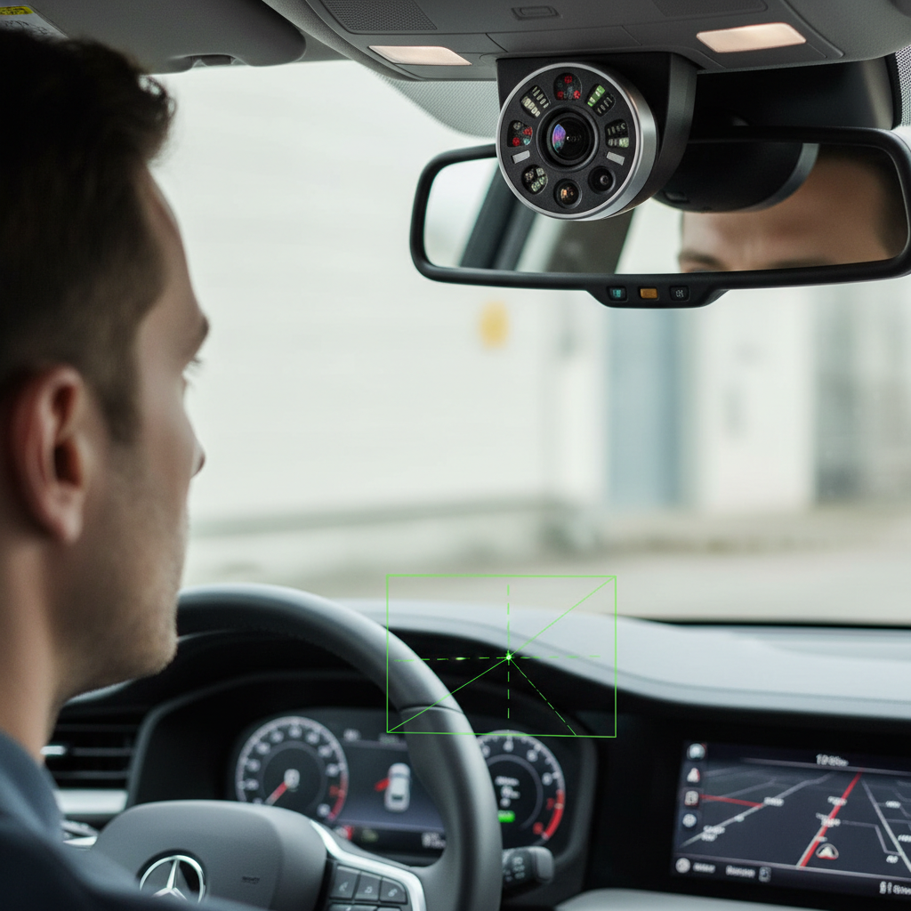 Alt text: Modern car interior with visible driver monitoring sensors, digital driver assessment keyword.