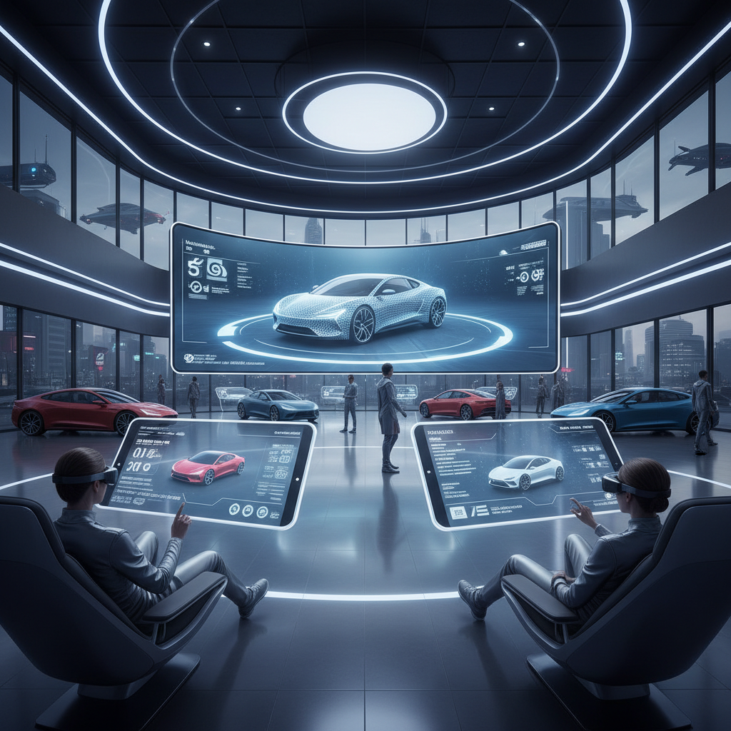 Alt text: Futuristic depiction of a digital dealership with no physical cars, just screens, symbolizing the future of end of quarter car deals.