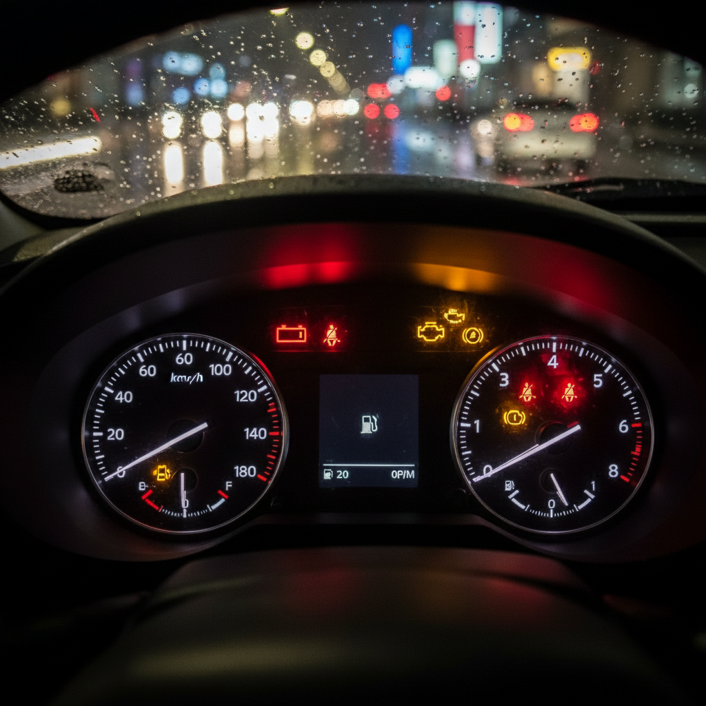 Car dashboard with warning lights illuminated, symbolizing crucial decisions in engine maintenance and replacement.