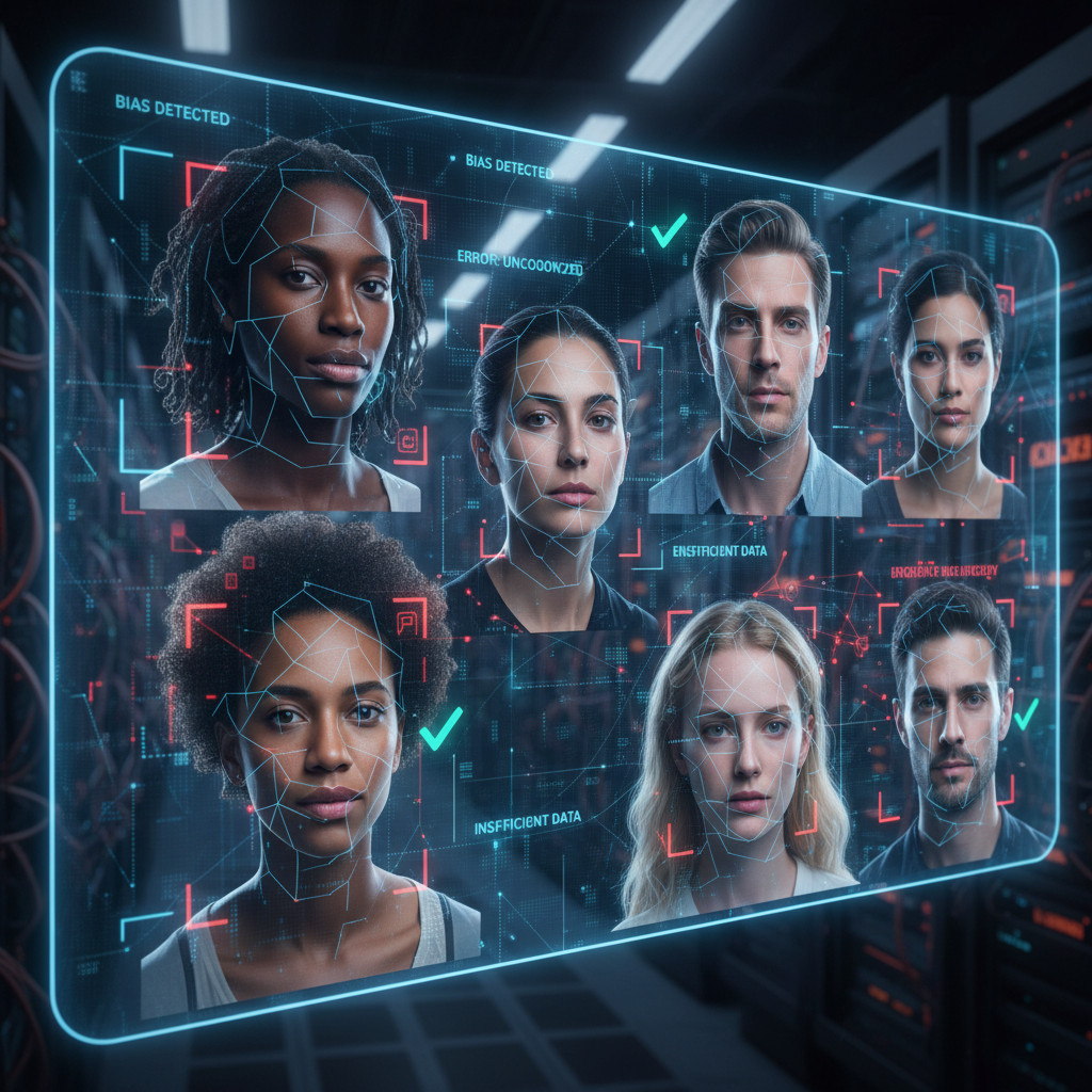 Facial recognition bias illustrated through a split-screen of diverse faces and algorithm overlays, highlighting misidentifications