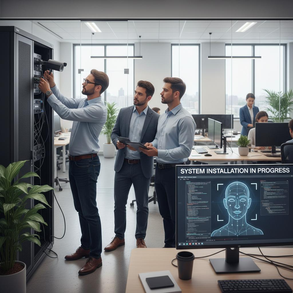 IT team deploying facial recognition system in an office, highlighting the importance of secure and responsible implementation