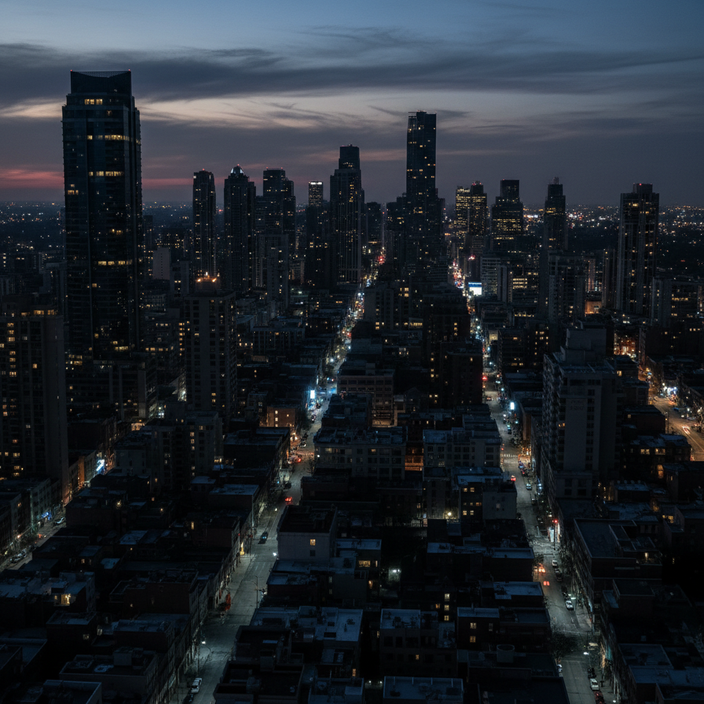 Alt text: Flickering LED streetlights casting harsh light on a neglected city street, symbolizing the challenges of large-scale LED adoption.