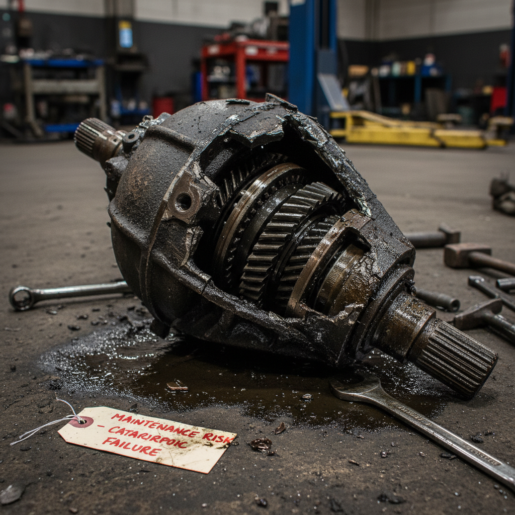 Image: Photo of a broken differential on a mechanic’s bench. Alt: Damaged limited slip differential gears, highlighting maintenance risk and the importance of proper limited slip care.