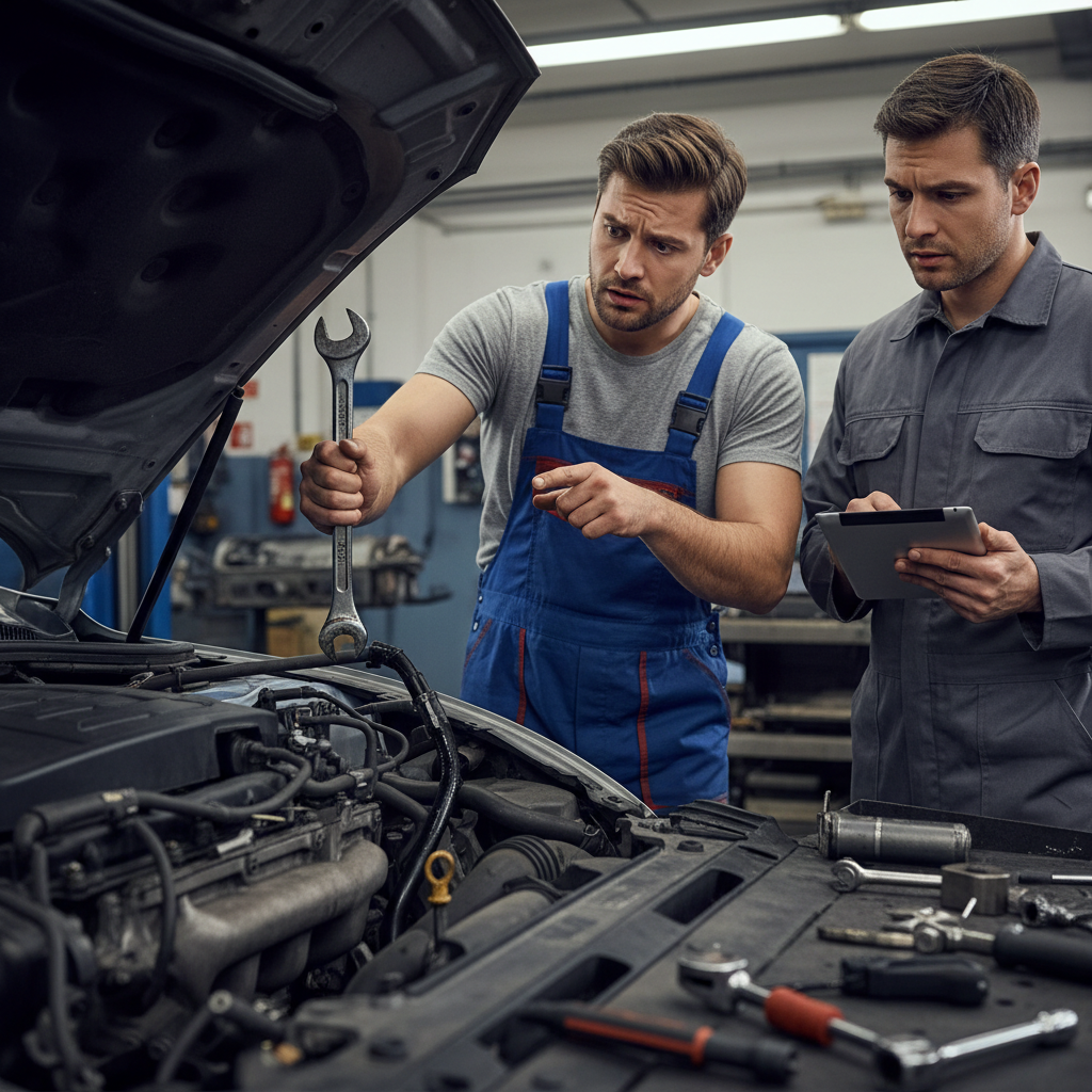 Picture the inspection bay: harsh overhead lights, the clatter of tools, and the wary buyer pacing the stained floor. The mechanic’s workstation is chaos—worn gloves, diagnostic tablets, a battered inspection sheet with boxes to tick and notes to scribble. There’s tension in the air because what’s found (or missed) here could make or break your deal.