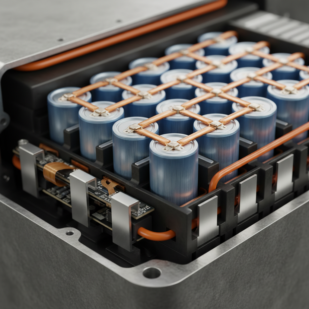 Alt text: Macro photo of EV battery cells showing modern battery technology and energy density