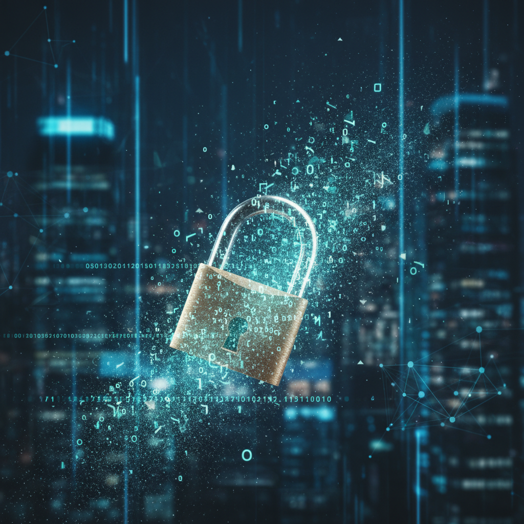 Open lock dissolving into digital code—reminding us that absolute security is an ever-shifting horizon.