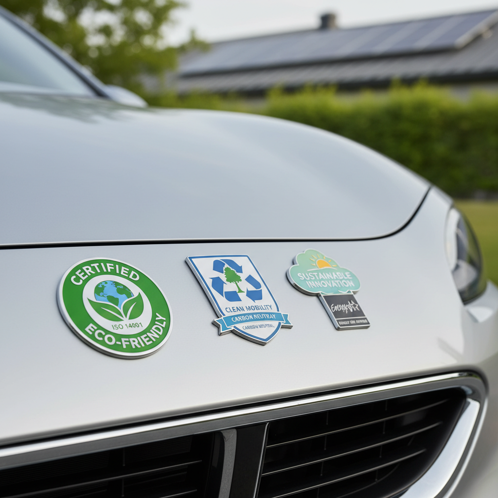 Alt: Car displaying various green certification badges and eco-labels emphasizing sustainability.