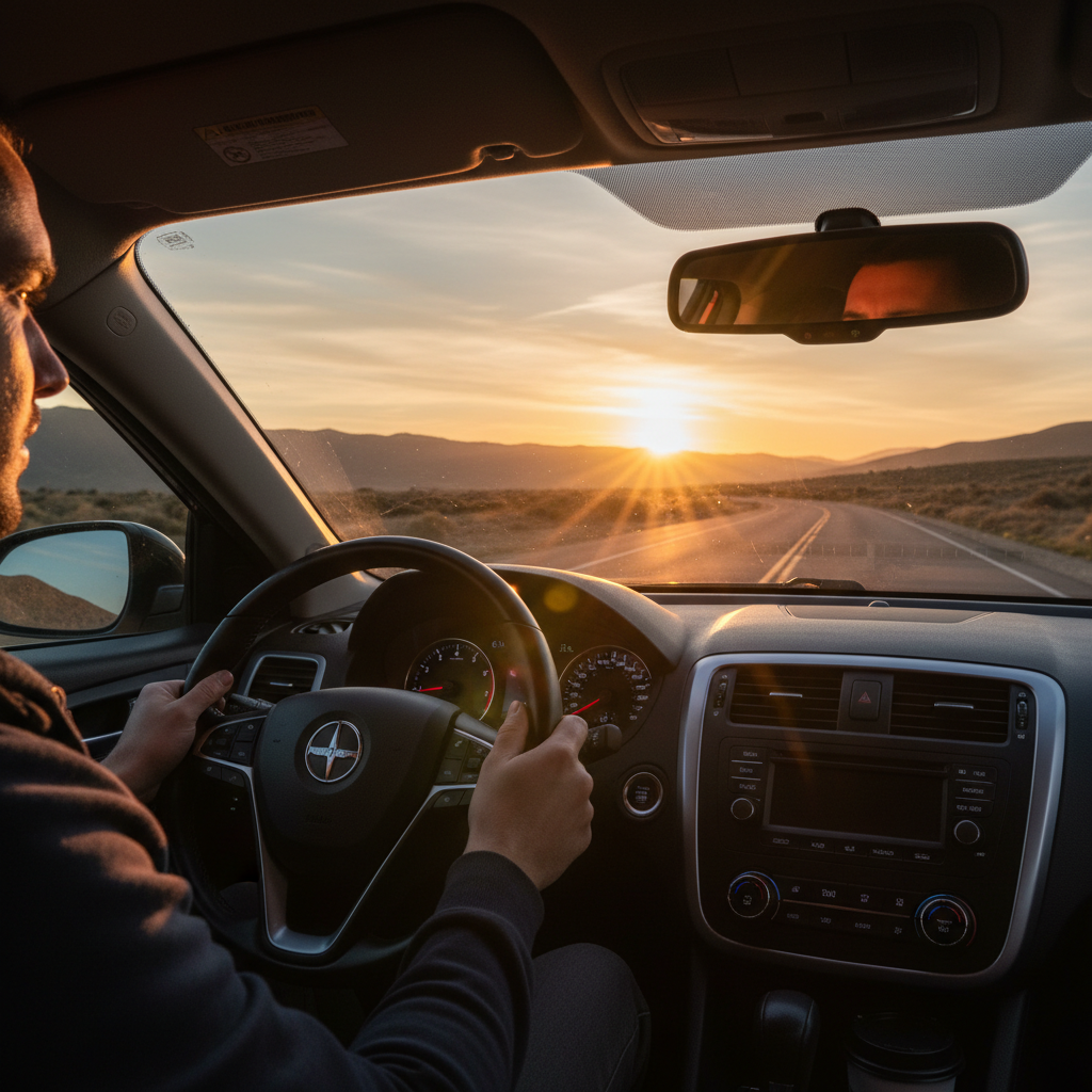 Alt text: Person behind the wheel at dawn, illuminated dashboard symbolizing a new era in automotive technology.
