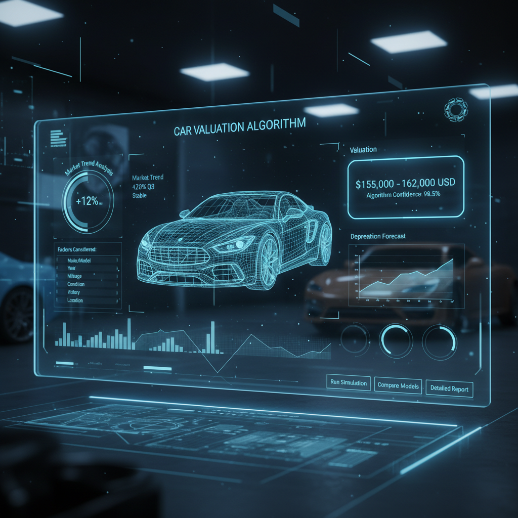 Image: High-tech dashboard showing car valuation algorithms at work. Alt: Car value algorithm visualized on digital screen.